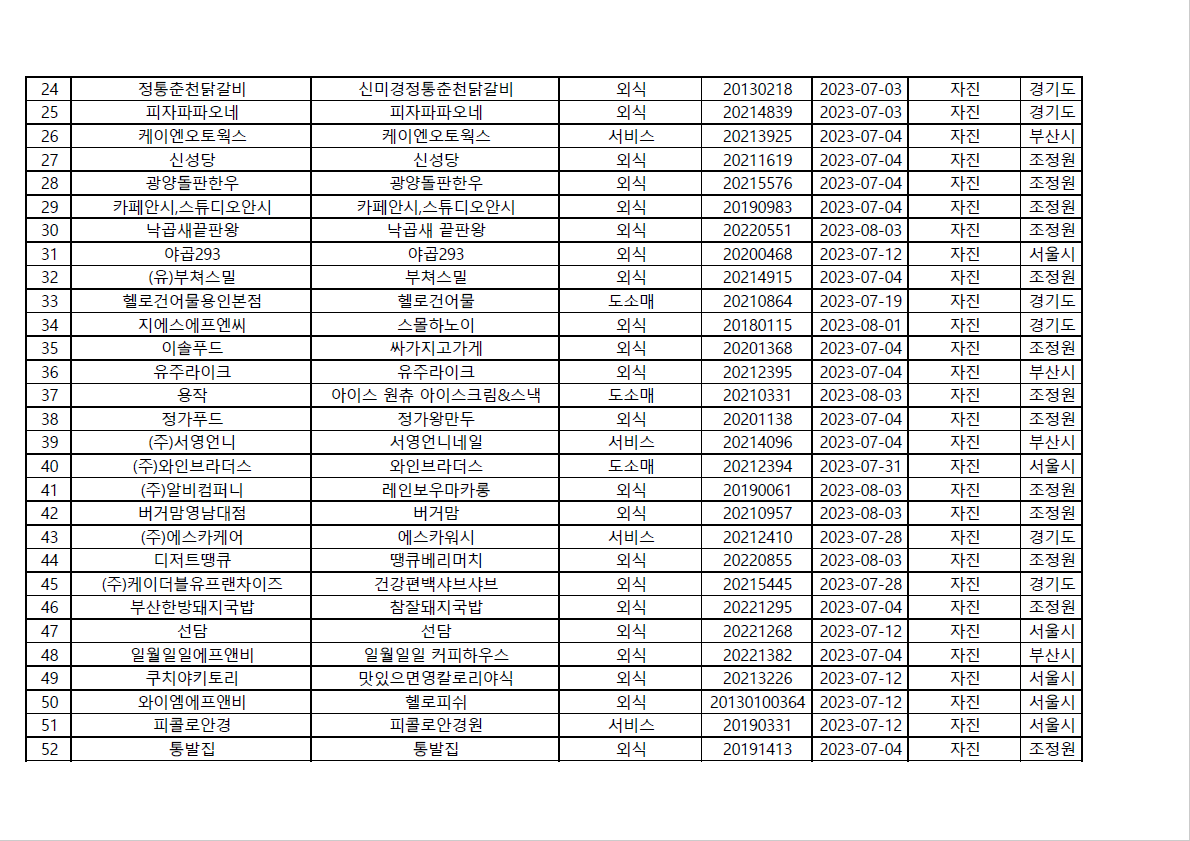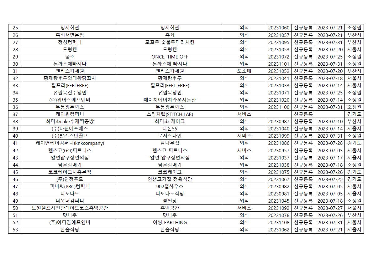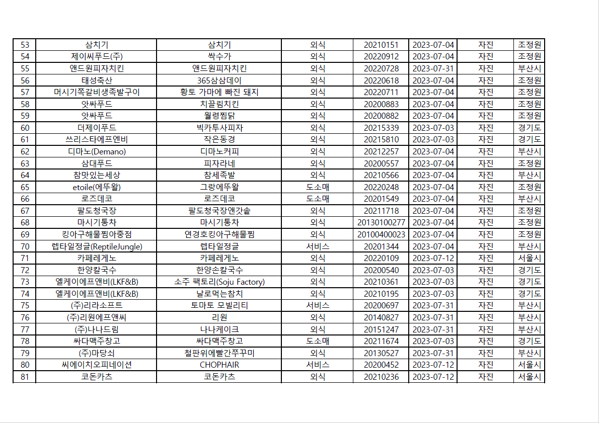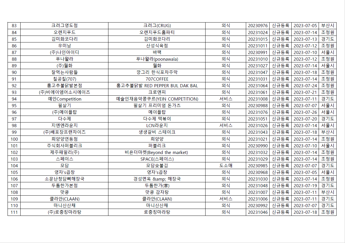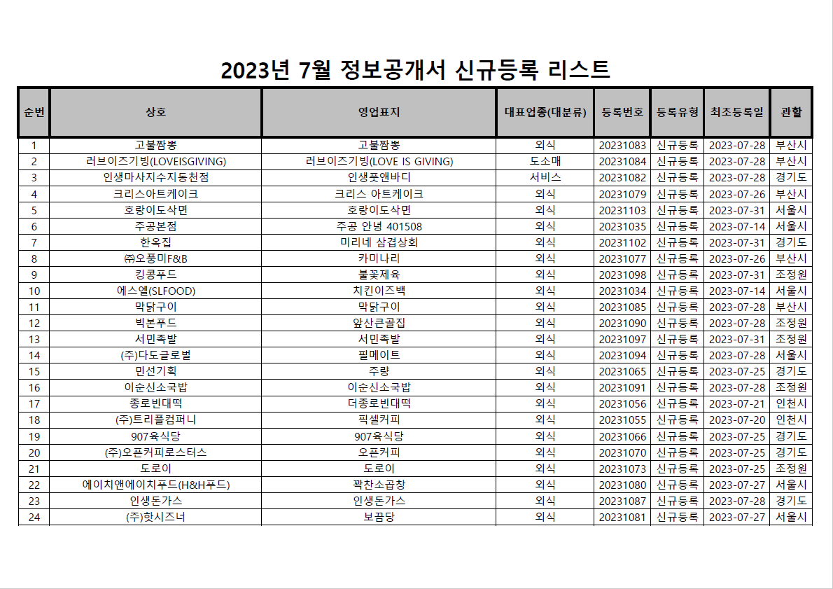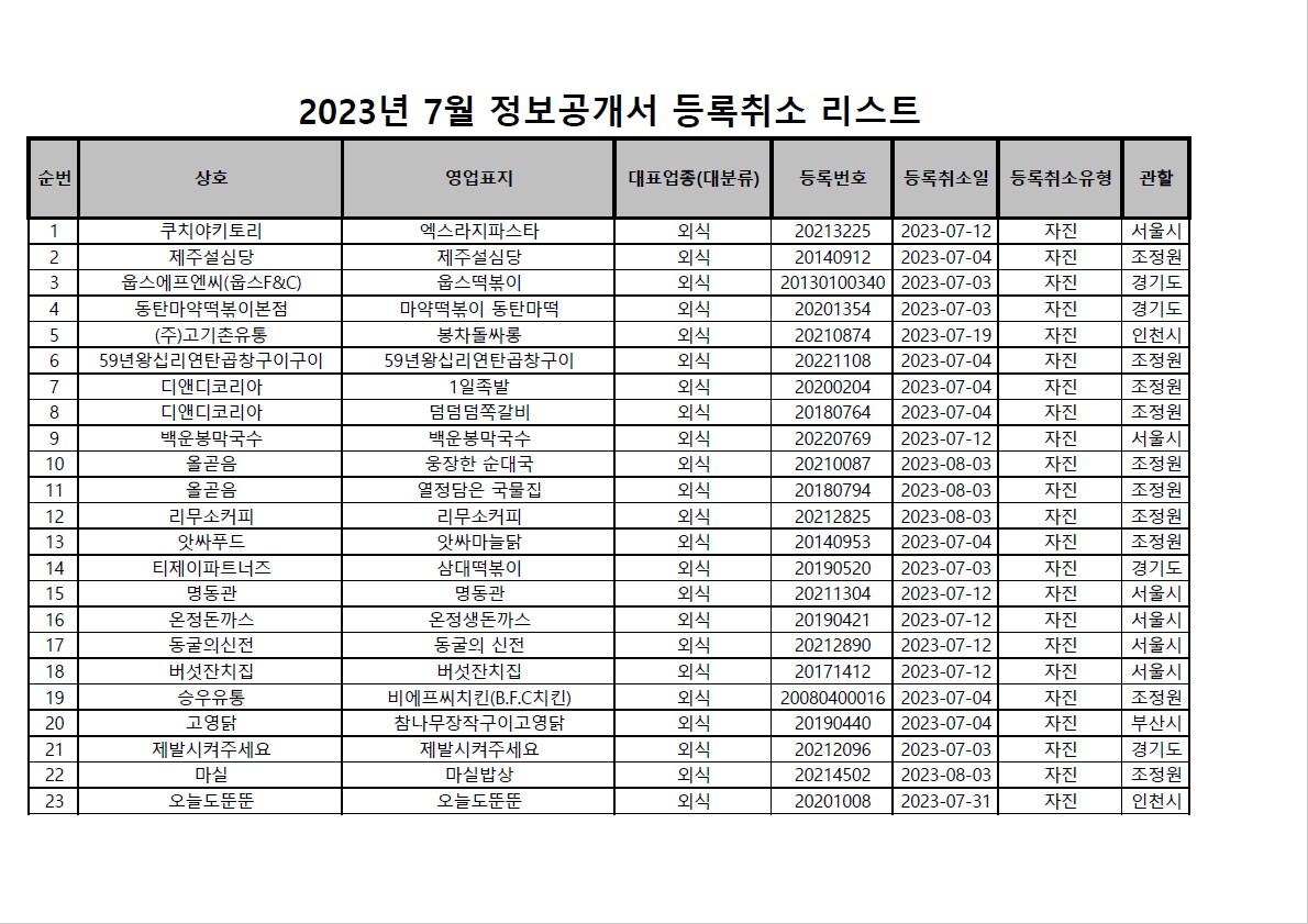 정보공개서 프랜차이즈 2023년 7월 신규등록 및 등록취소 발표