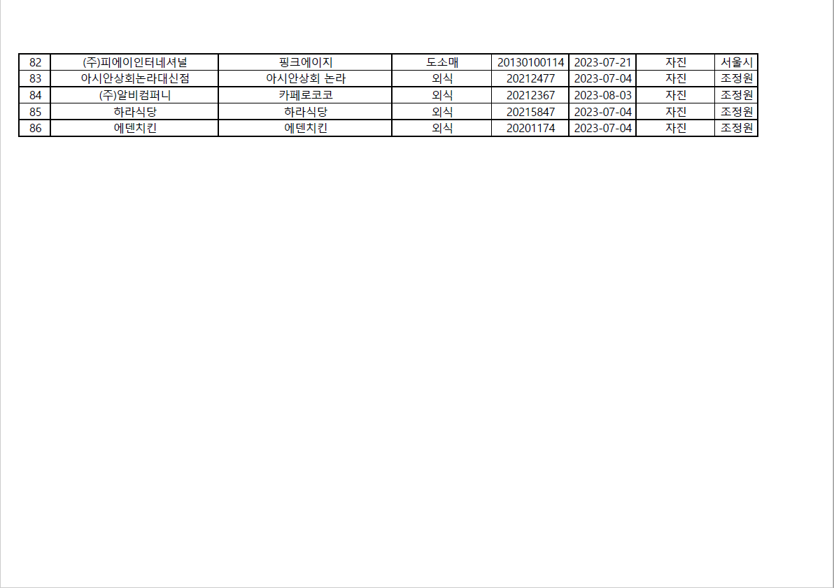 순번 | 상호 | 영업표시 | 대표업종(대분류) | 관할